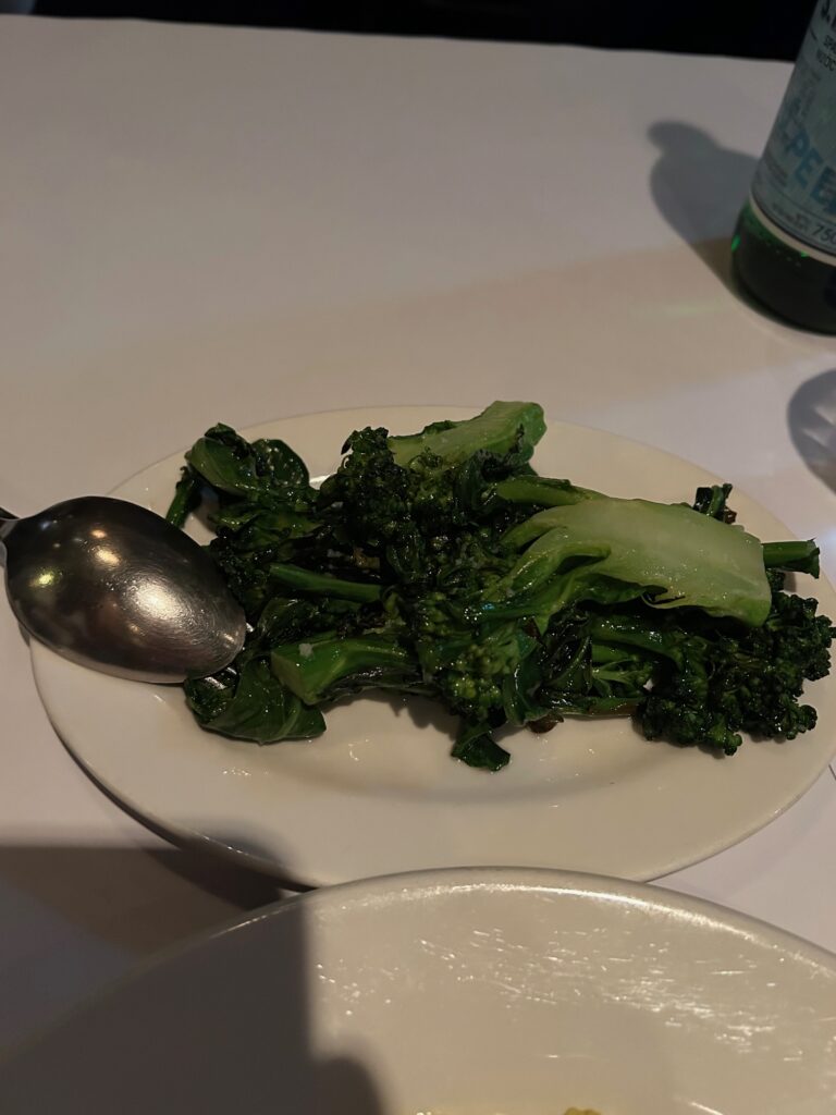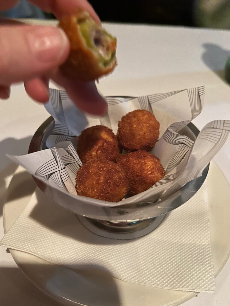 A perfectly al dente, yet soft, creamy and flavoursome risotto, with each grain coated in the starchy, cheesy sauce, is my idea of heaven. I’ve eaten a lot of risottos in my time, but the one at Fratelli Paradiso is probably the best. It’s not complicated, or fancy, just cooked Milanese style with threads of saffron for colour and flavour, then topped with three plump scallops and a swirl of a beef jus. Of course, it contained just enough Parmigiano Reggiano cheese to give it that sharp salty note that only the best version of the cheese can. I also ordered a small bowl of Ascolane – cheese stuffed green olives that are crumbed and fried; and a side of broccolini, perfectly sautéed in garlic, chilli and olive oil.