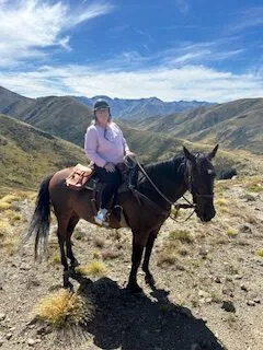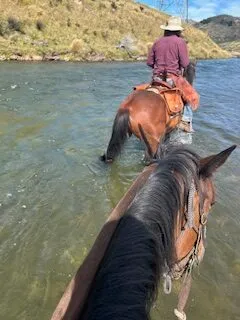I’ve only been riding a dozen or so times in my life – so ticked ‘beginner’ on the pre-ride forms. It was, however, the most challenging ride I’ve ever been on. We went up hill and down dale, quite literally. Kevin (my horse) was such a good boy – an older and very calm horse who was very obedient and well-behaved. After about 20 minutes riding across the plain beside the river, we headed into a densely wooded pine forest that sat on the side of a mountain. It was steep going, quite muddy and there were soon lots of scratches on my left leg where Kevin took the corners sharply. I had to lean forward a lot on the steep inclines, but the spectacular scenery once we got to the top was well worth it. What goes up must come down, so after a short break to admire the view, we began the ride down on the other side of the mountain. While it didn’t have any trees to scratch me, I did have to do a lot of leaning back so I didn’t slide off! I think I used muscles that haven’t been awoken in years – my backside, legs and especially my knees were aching! Once on the flat area again we rode the horses to the river, where they had a lovely splash and a drink of the rapidly flowing cool water, before I successfully dismounted and found Dave reading a second-hand book in the car. For those of you who know the story – a few years back I had an accident getting off a horse and broke my leg and ankle… but just like falling off a bike – only thing to do is get back on!