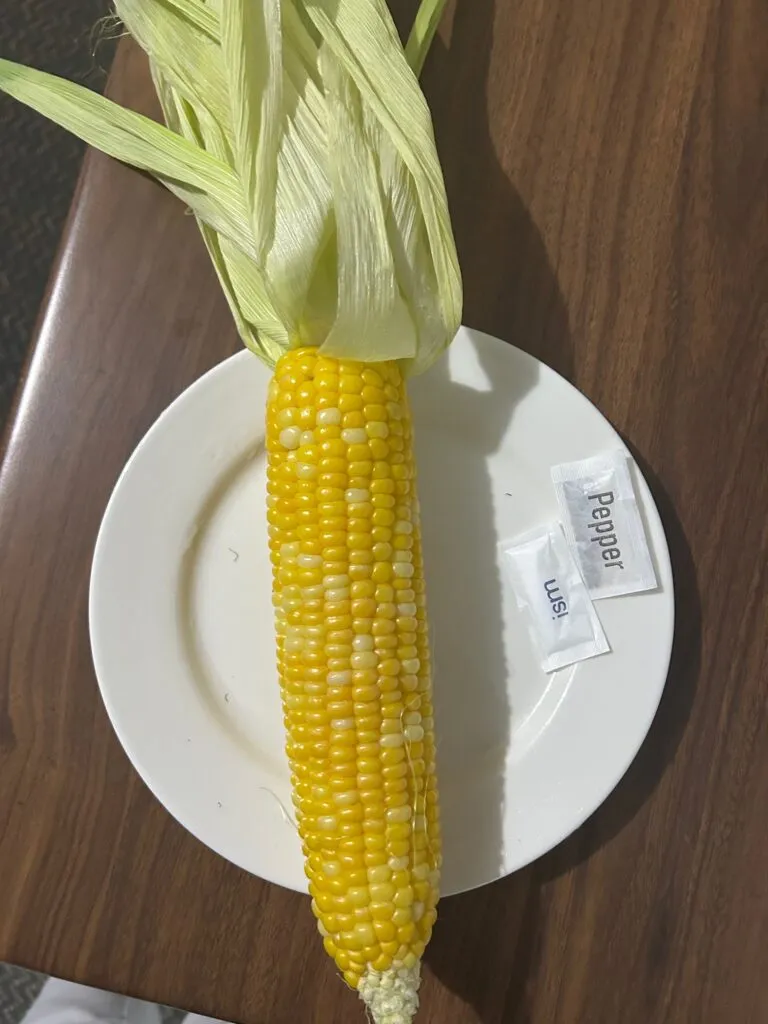 TV and reading took up the rest of the evening, apart from a quick bedtime snack. Sometimes I even amaze myself on how much I can eat! We had seen lots and lots of corn crops along our drives and had bought a single ear of corn ($1) – which I microwaved (complete with husk) for three minutes – peeled and then sprinkled with the seasoning we found in the motel room. No butter, but actually it was really good without it. So fresh, sweet and yummy. Yet another example of the simple things often being the best!