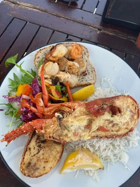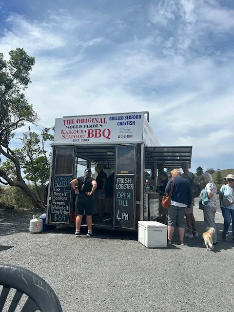 Tuesday involved a 150km drive south down Highway 1 to Kaikoura. With a population of just over 2,000 it’s a small but pretty town, that thrives on a good tourism economy. Kaikoura is famous for a few things none less than Lobsters with it known as ‘the home of crayfish.’ What better reason to enjoy a lobster for lunch, which we did sitting on a wooden table beside the Kaikoura Seafood BBQ shack where they cooked my half lobster and 1/2 dozen scallops with garlic butter on their primitive BBQ grill. Oh, my goodness – I cannot tell you how good this was… fresh, flavoursome, salty, messy and very, very delicious. And very simply prepared and cooked – who needs fuss and bother when the basic ingredients taste this good!