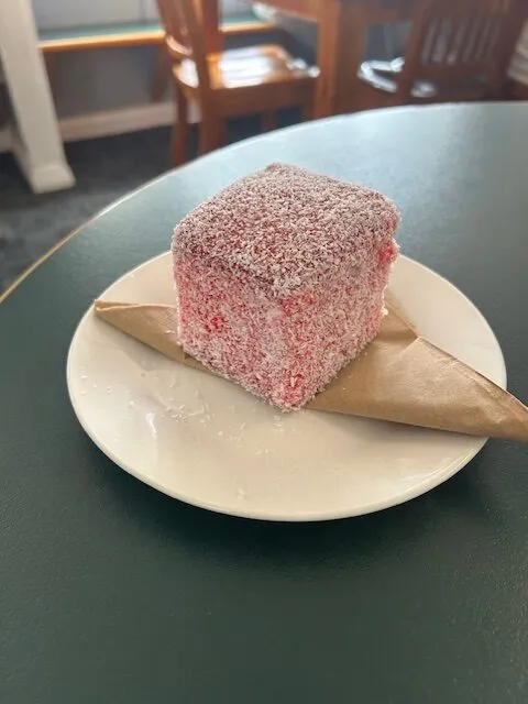Last thing eaten in NZ by Dave was this – a pink lamington, served with tea for two in a roadside diner a few hours ago as we drove back to Christchurch. Again, simple but delicious, and basic roadside diners here seem to get it right!